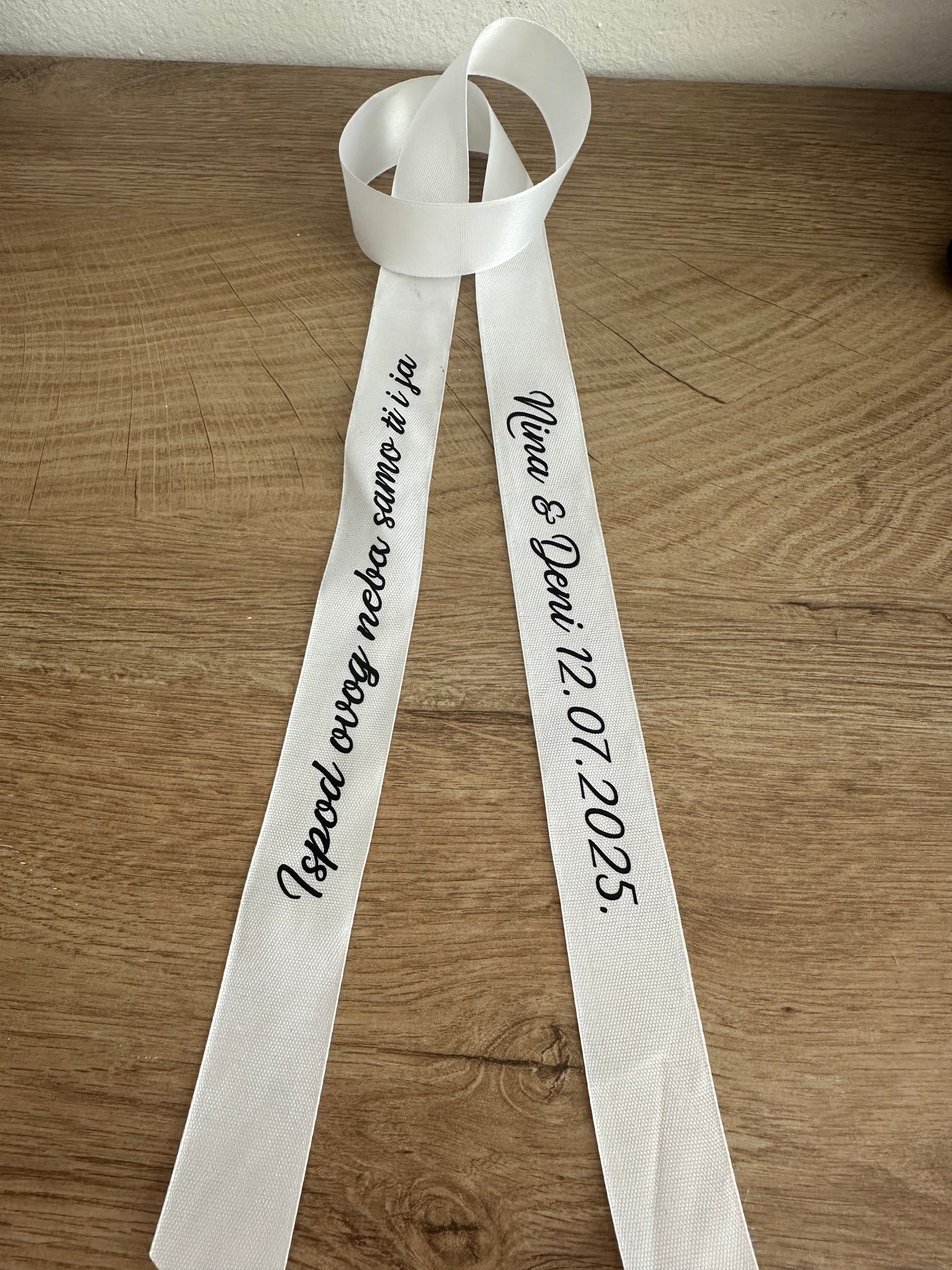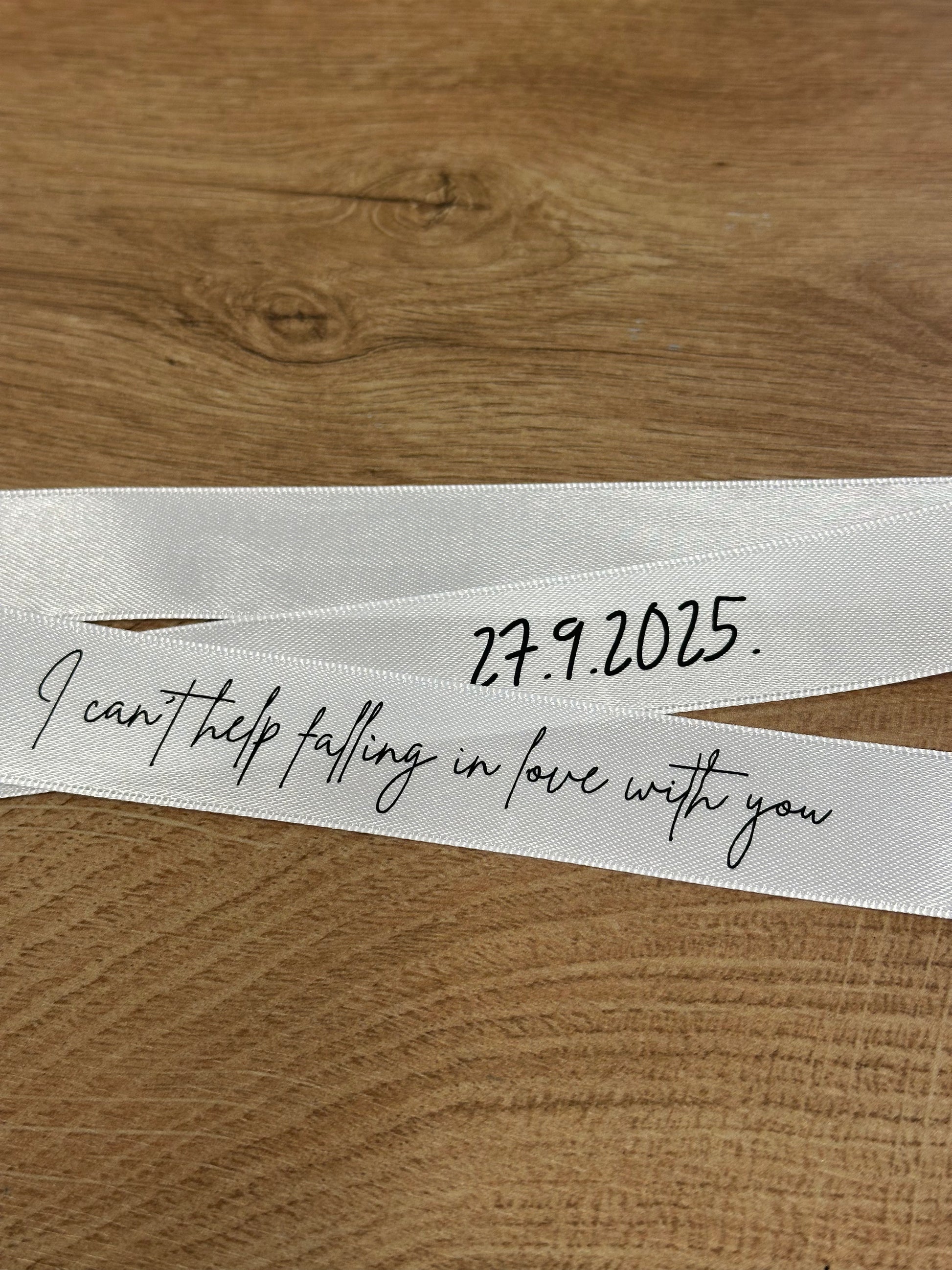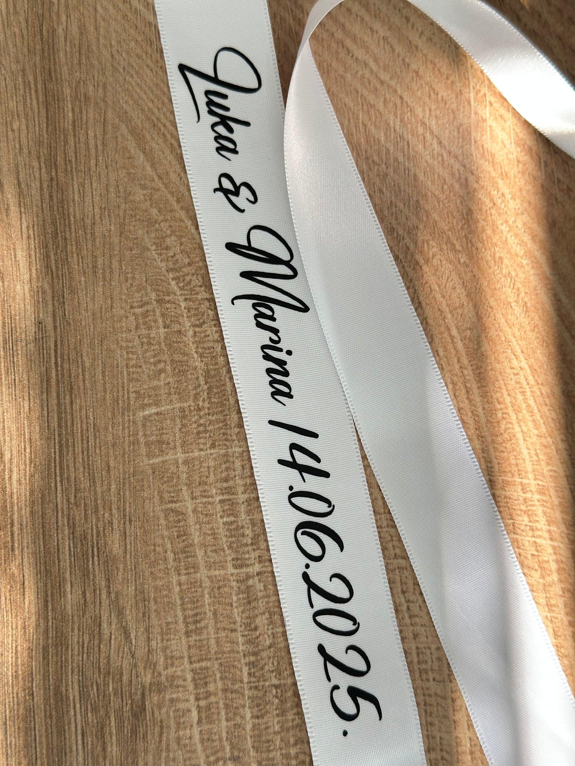 Personalizirana traka širine 2.5 cm i dužine po izboru za vjenčani buket, čaše, poklone… Tekst može biti psalam, citat, poruka, imena i inicijali mladenaca, datum i slično (maksimalno cca 20 cm dužine).